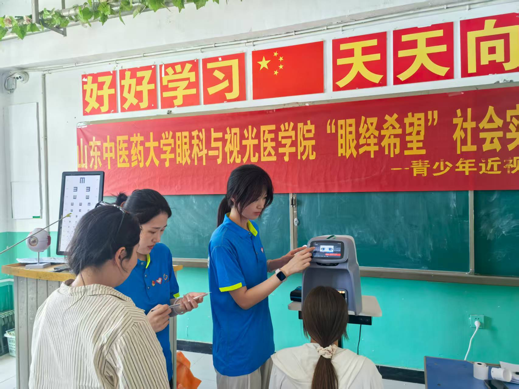 为实现从认知到行动的闭环,服务队利用视光仪、电子视力表等专业设备为在校学生一百余人进行了视力检测、屈光检查及用眼习惯评估。通过数据筛查,团队发现部分学生存在用眼习惯不良、近视未及时矫正等问题,针对近视高风险学生,团队成员现场给予近视防控科普并进行针对性指导,借助眼球模型和近视防控宣传册,生动科普了眼健康知识和护眼方法,帮助学生们树立“早防、早控”意识。通过此次视力健康“大体检”,服务队掌握了英吉沙第一中学学生群体视力健康状况,为后续制定个性化防控方案、开展精准护眼指导提供了科学的数据支撑,切实将关爱落到实处,为光明未来保驾护航。