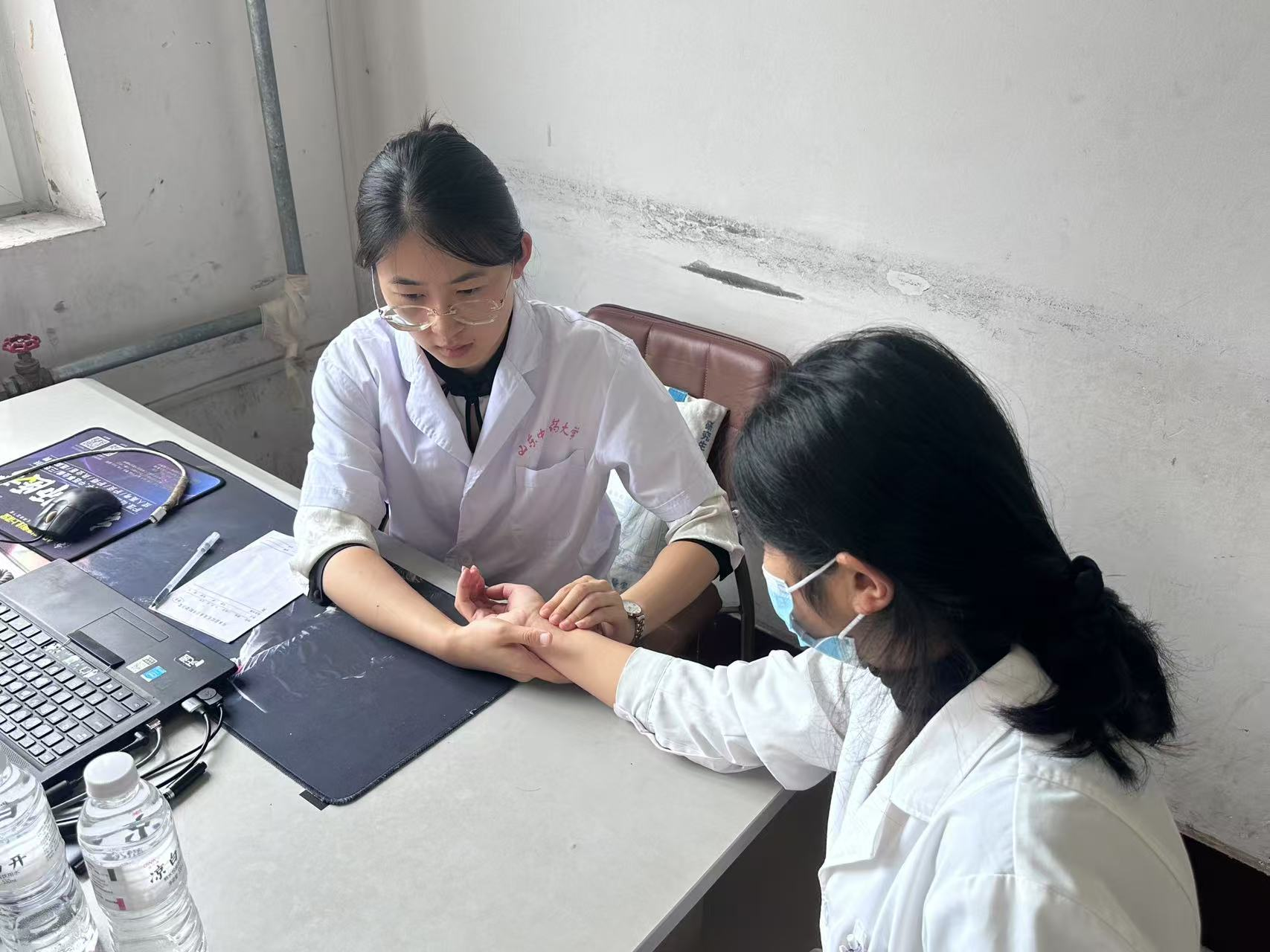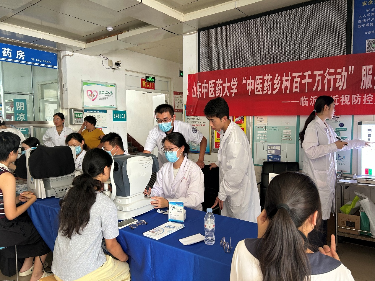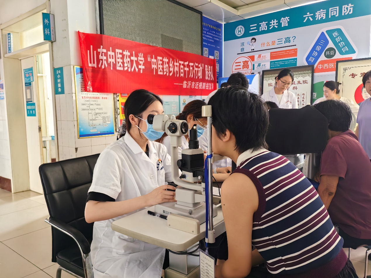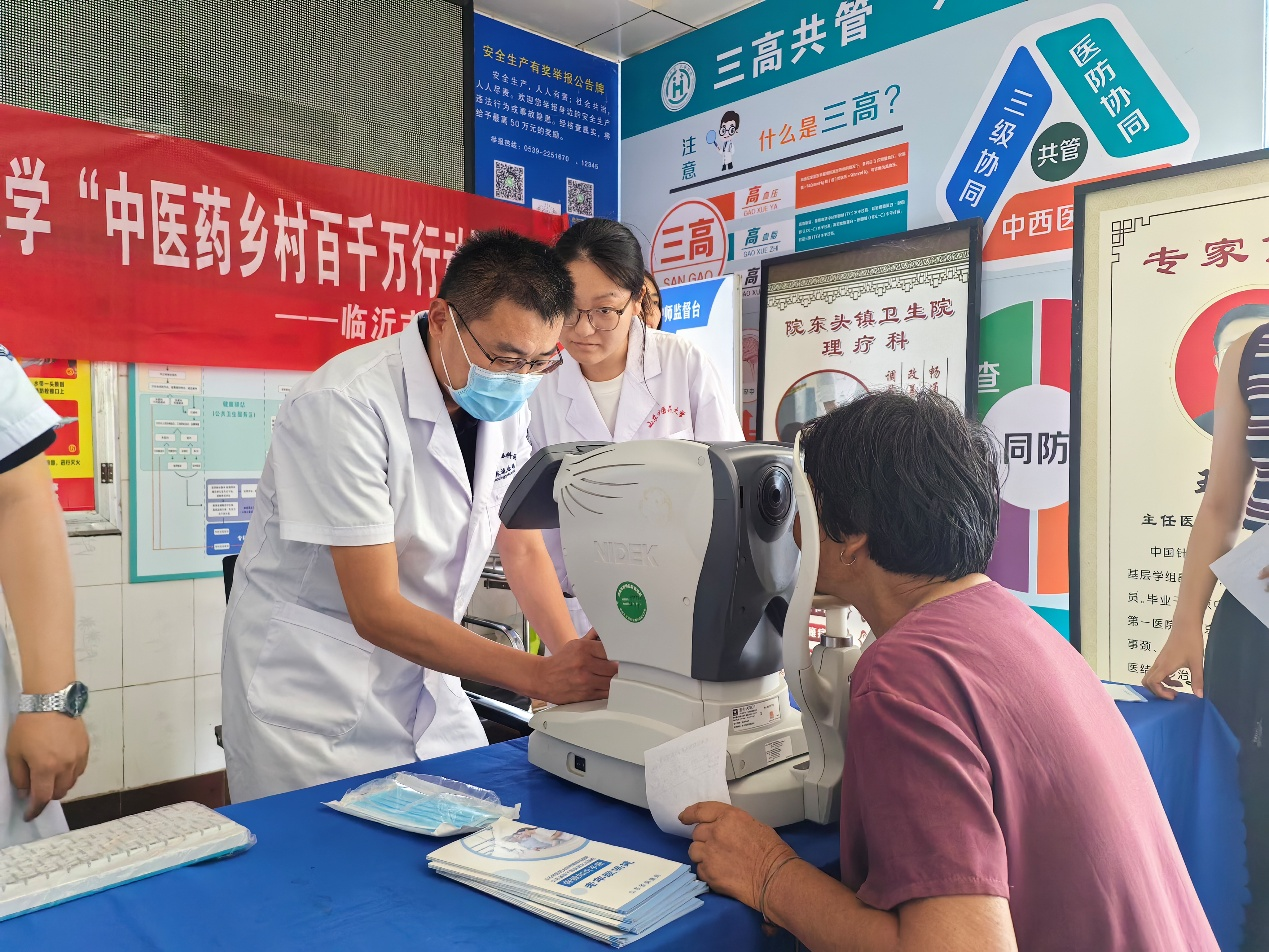 座谈会后,附属眼科医院义诊团队、博硕实践团赴沂水县院东头镇卫生院开展眼科特色义诊活动。眼科专家为居民开展视力检查、眼压测量等项目,细致筛查白内障,青光眼、近视等常见眼科疾病,针对性给出治疗建议,还通俗讲解了近视防控、眼病防治等健康知识。博硕实践团成员为村民提供中医义诊、体质辨识、耳穴压豆等服务,助力基层中医健康素质提升。