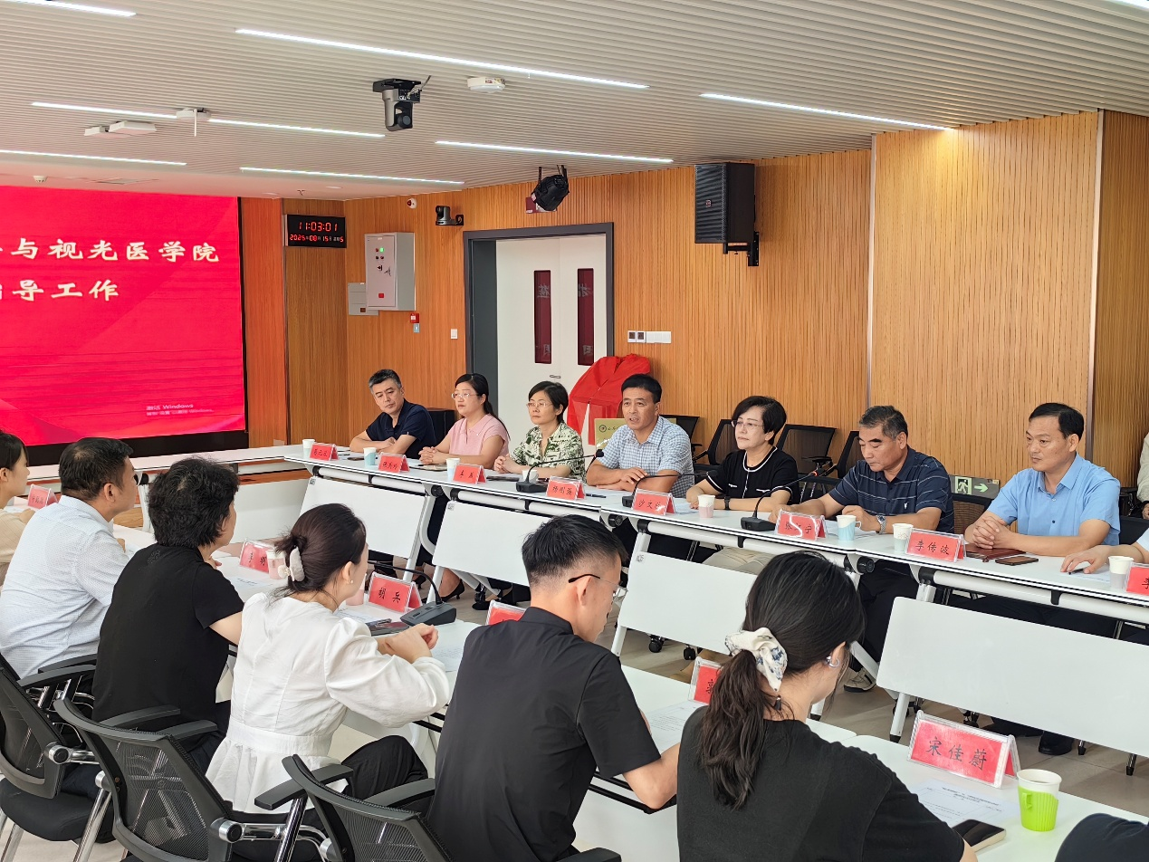校地合作洽谈会在沂水县人民医院学术报告厅召开,沂水县卫生健康局党组成员沙文欣、医院党委书记杨刚强、副院长李燕、纪委书记李传波等出席本次座谈会。沙文欣、杨刚强分别在讲话中对我院一行的到来表示欢迎,并提及沂水风土人情独特、中医药根基深厚,希望以“岐黄驿站”揭牌为契机深化合作,助力提升全县中医药服务水平,也进一步加强眼科领域的学习和交流。胡兵介绍了学校、学院的发展历程和学科特色,指出“岐黄驿站百千万行动”旨在发挥学校中医药资源优势,助力乡村振兴事业,期待未来携手共进,加强相关领域的交流与合作,推动“岐黄驿站”成为校地协同、人才成长的平台。
